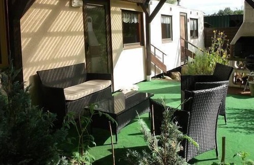 The living room opens onto the terrace with garden furniture, a grill and a fireplace. You can enjoy evenings here by the crackling fire. The terrace affords a beautiful view of the meadow and forest. A 400-year-old oak tree that reaches up higher than the accommodation provides shade. The big lawn provides plenty of space for palying. Children will enjoy the sandpit, swing and slide. Badminton equipment and other toys are available.