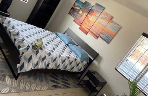 Este alojamiento de 2 dormitorios y 1 baño cuenta con un sofá cama, una zona para barbacoas y escritorio. El cuarto de baño incluye un secador de pelo, toallas y papel higiénico. Prepara una comida casera en la cocina, equipada con horno, placa de cocina y frigorífico, además de cafetera y tetera, máquina de hielo y microondas.