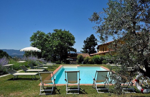 Alrededor de la villa c & # 39; & egrave; un césped verde perfecto también para juegos para tus hijos. Desde la hermosa piscina podrá disfrutar de una vista panorámica de las montañas de Pratomagno y el valle de abajo.