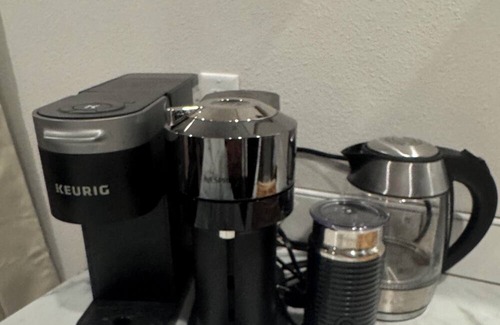 In the open-plan living room, you'll find a comfortable queen-size sofa bed, a second smart TV, and a cozy workspace. Hardwood floors add warmth throughout the unit, making the space feel polished and easygoing. The kitchenette is fully stocked with essentials, from an electric cooktop, microwave, and convection oven to a full-size fridge and counter seating. Morning routines are a breeze with both a Nespresso and a Keurig machine, plus a tea kettle and a selection of coffee and teas.