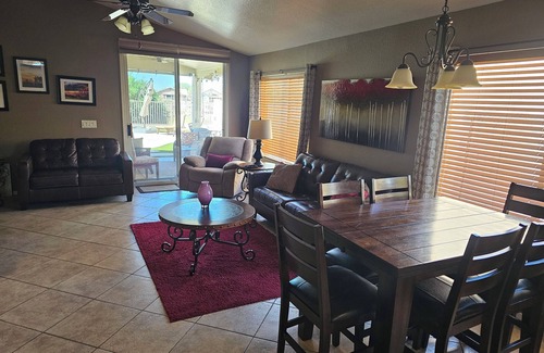 Muy bonita casa de 2 dormitorios con piscina situado en la mesa de salida del hoyo 3. Podrá relajarse en la piscina mientras disfruta de las hermosas puestas de sol. Esta casa se encuentra a 10 minutos en coche de los campos de entrenamiento Mariners, Padres, Rangers y Royals, y a solo 30 minutos del estadio de la Universidad de Phoenix. Otra gran ventaja de esta casa es que también el propietario de la casa justo al lado que da a los inquilinos la posibilidad de alquilar casas al lado de uno de los grupos más grandes que desean permanecer cerca uno del otro. Echa un vistazo a la lista de VRBO 786970. Grande para las tertulias familiares más grandes! Las reservas para las dos casas juntas están disponibles ahora.