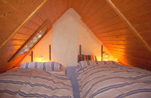 El estudio del ático convertido (90 metros cuadrados) con un ambiente acogedor ofrece en una gran sala Schlafmöglichekiten para 4 personas en 2 niveles, parcialmente separados por cortinas y divisor de la habitación. Hay un baño independiente con ducha y aseo, así como una zona de cocina bien equipada con lavavajillas.