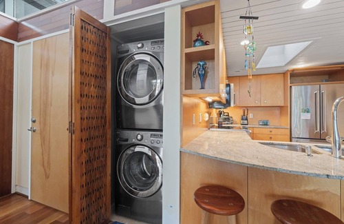 El Grand Oceanfront Apartment tiene 1100 pies cuadrados y abarca más de 90 pies de metraje frente al mar. Incluye la gran sala original de 750 pies cuadrados de la finca que ofrece vistas panorámicas del océano. Es el lugar de reunión ideal de la finca e incluye una terraza frente al mar parcialmente cubierta con vistas a la piscina y una terraza cubierta a lo largo de la parte delantera de la finca con muebles de teca al aire libre. Cuenta con una amplia sala de estar y comedor, chimenea de travertino original, cocina remodelada con barra y baño completo con ducha a ras de suelo. La suite de un dormitorio frente al mar cuenta con un clásico juego de dormitorio de teca danesa con baño de spa de teca con baño privado y una cubierta de teca frente al mar. También tiene una oficina separada con una cama plegable y una cama plegable en la gran sala para invitados y tiene capacidad para seis.