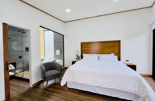 Nuestra habitación esta equipada con una cama king muy confortable, un minibar para consumo del huésped, una pequeña estación para hacer café o té, televisión inteligente y un jacuzzi dentro de la habitación. Un pequeño balcón exterior le da un espacio para disfrutar del bosque frente a las habitaciones, y del cual se pueden apreciar los celajes del atardecer. Es un espacio cómodo, moderno y en una ubicación muy céntrica a 3 minutos en vehículo o 15 minutos caminando de Santa Elena el centro de Monteverde. Ahi encontrará restaurantes, supermercados, tiendas de souvenir, bancos y otros servicios que necesite. Desde nuestro alojamiento también podrá accesar a los diferentes atractivos turísticos que ofrece la zona ya sea en su propio transporte o el de los diferentes tours de la zona. Pueden preguntarnos por recomendaciones de actividades que hacer en Monteverde, o cualquier otra información que necesiten.