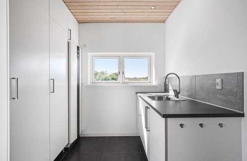Preciosa casa de vacaciones en lo alto de una colina, con vistas a las zonas de casas de vacaciones más nuevas de Spodsbjerg. La luminosa casa está amueblada con muebles modernos y bien equipada. El gran cuarto de baño con bañera de masaje y sauna hará las delicias de toda la familia. Hay buenas condiciones de acceso para coches con remolque de barco. Un congelador de 150 litros para el pescado está a su disposición.