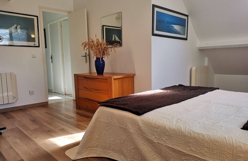 Apreciará la elegancia de esta habitación, un lugar de tranquilidad y relajación, con paredes claras, techo abuhardillado con vigas a la vista, decoración hecha para enfatizar que se encuentra en Bretaña, a tiro de piedra del mar.
