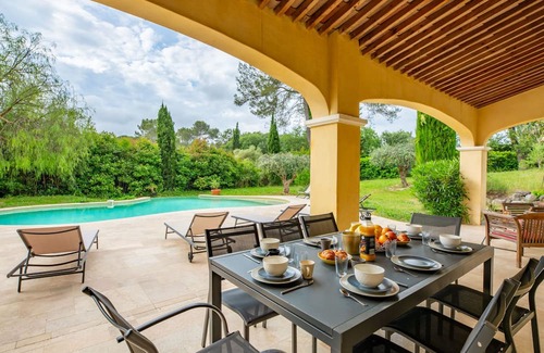 Large, comfortable single-family house "La Pimaleanne", 2 storeys. Outside the resort, 4 km from the centre of Roquefort-les-Pins, residential area (villas), in a cul-de-sac. Private: property 2'200 m2 (fenced), swimming pool (10 x 5 m, depth 150 cm, seasonal availability: 01.Apr. - 31.Oct.) with alarm system and salt-electrolysis pool-cleaning system. Table tennis, parking (for 2 cars), single garage. Shop 2 km, supermarket 3.5 km, restaurant 2 km, bus stop 2 km, shingle beach 16 km. Golf course (18 hole) 7 km. Nearby attractions: Grasse 13 km, Cannes 22 km, Nice 27 km. The owner does not accept any youth groups.