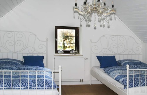 The linden tree on the Herrnkopf protected as a natural monument and the country house has been a unity for over 150 years. Located in a 10,000 sqm park area with old trees (mammoth trees, trumpet tree, gingko, cedar), the romantic holiday home becomes an ideal place for rest and relaxation. In 2016 the house was completely renovated and the demands were adapted to an upscale holiday home in the sanitary area. Atmospheric details, such as folding shops, lead glazing and oak paneling, were left. Likewise, the vine -like dining area with tiled stove, fireplace and corner bench, which is separated from the white dream kitchen by a bar. The combination of ancient furniture from Baroque and Biedermeier with state -of -the -art equipment is philosophy of the house.
