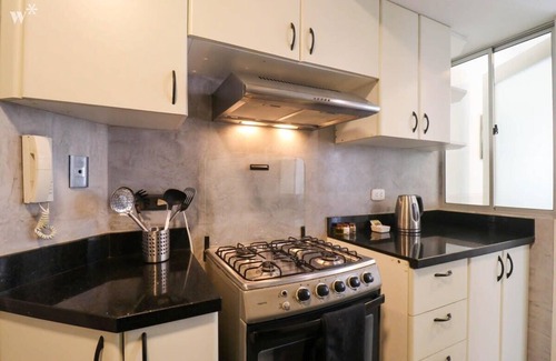 Ubicado en el acogedor vecindario de Miraflores, este hermoso apartamento de 2 habitaciones cuenta con dos camas tamaño queen, un comedor para seis personas, una sala de estar con un televisor inteligente de 50 "(incluido Netflix). Está muy bien ubicado, a 80 metros del centro comercial Larcomar, a poca distancia de los mejores supermercados, restaurantes y cafeterías.
