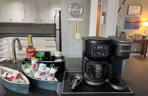 The modern kitchen comes fully equipped with everything you need to cook and gather: stainless steel appliances, cookware, a coffee maker, and generous counter space. Both bathrooms are stocked with fresh towels, a hair dryer, and basic toiletries to make packing light and easy.