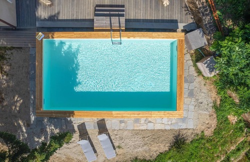 Disfrute de la elegancia de esta casa de vacaciones modernizada con piscina y hermosas vistas.