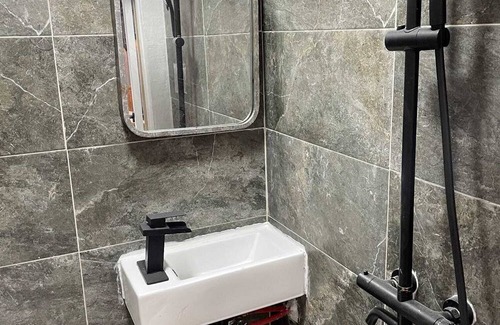 The bathroom is compact and designed in a “three-in-one” wet-room style, where the toilet, sink, and shower share the same space. It’s functional and clean but small, ideal for short stays or travelers comfortable with a minimalist setup.