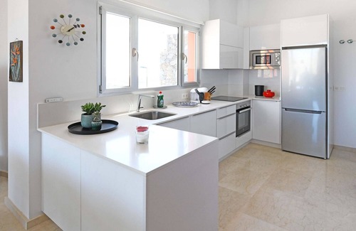 La cocina americana, de inducción, está equipada con nevera, microondas, horno, congelador, lavadora, secadora, lavavajillas, vajilla y cubertería, utensilios de cocina, cafetera, tostadora y hervidor de agua.