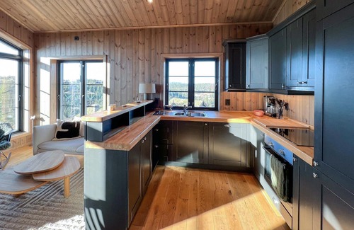 This cosy and spacious cabin welcomes you with a bright and comfortable interior, where you can enjoy an unforgettable break with extended family or good friends. Host cheerful cooking evenings, get together for harmonious meals at the long dining table and round off a long day in the fresh air in the sauna, by the fireplace or with a good film.