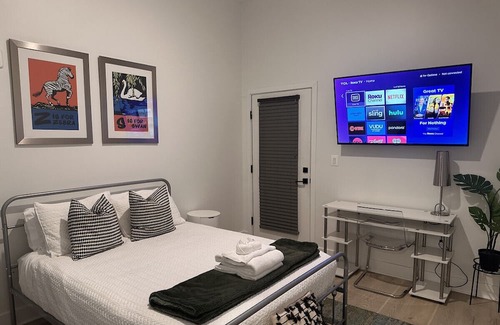 Este alojamiento de 1 dormitorio y 1 baño cuenta con aire acondicionado y escritorio. Conéctate al wifi gratis, o relájate frente a un Smart TV. También hay un reproductor estéreo. El cuarto de baño incluye un secador de pelo y toallas. La cocina está equipada con horno, placa de cocina y frigorífico, además de cafetera y tetera, microondas y utensilios de cocina. Y no tendrás que llevarte ropa de más, porque podrás aprovechar la lavadora y la secadora. Otras comodidades incluyen ropa de cama, una tabla de planchar, calefacción y una silla de oficina.