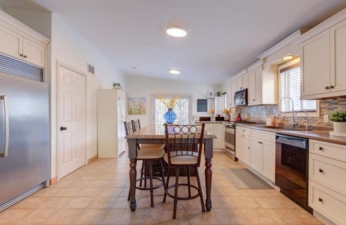 The fully equipped gourmet kitchen includes modern appliances, a large fridge and freezer, and everything you need to cook, bake, or unwind with a glass of wine. Outside, enjoy the firepit under the stars, relax in the year-round hot tub, or cool off in the seasonal inground pool (May–September).
